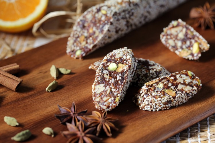 - اطحني المكسرات، ثم اخلطيها مع التمر وأضيفي الهيل، ثم اعجني المكونات جيداً.