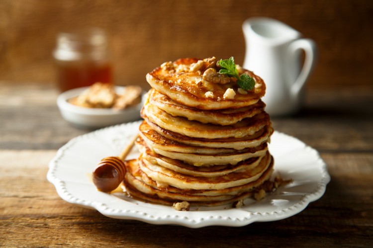 - ضعي البان كيك في طبق التقديم، وزينيه بالجوز وقدميه إلى جانب العسل.