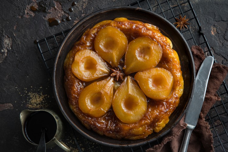 اقلبي كيك الكمثرى في طبق تقديم مفرود عندما يبرد تماماً، ثم قدميه.