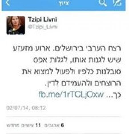 "ان قتل الطفل العربي في القدس حادث مروع يستحق الشجب والاستكثار وعدم التسامح مطلقا والعمل على تعقب واعتقال الفاعلين وتقديمهم للمحكمة وهذا هو بالضبط الفرق بين دولة إسرائيل والمنظمة الإرهابية ويجب علينا معاقبة بكل قوة كل من يحاول ويعمل على تحويلنا لمجتمع ارهابي وهذا لن ينجح ولن يكون" كتبت ليفني في تغريدتها التي ظهرت على صفحتها لدقائق معدودة قبل ان يتم ازالتها وتعذر مشاهدتها ثانة وفقا لموقع " nrg ".