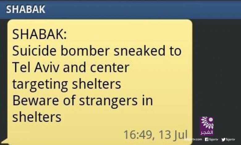 تلفزيون الفجر الجديد – ذكرت القناة العبرية الثانية إن مجموعة من "الهاكرز" التابعين لحماس أرسلوا رسالة لآلاف الهواتف الإسرائيلية على أنها من ا"لشاباك" حيث قالوا فيها إن فلسطيني يحمل حزاماً ناسفاً وصل إلى وسط "تل أبيب" وهدفه القيام بعملية تفجيرية ضد الإسرائيليين الذين يمكثون في الملاجئ.