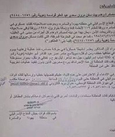 قرار هدم المنزلين بالكامل، صدر عن قائد قوات الاحتلال العسكري لمنطقة الخليل، الذي أعطى مهلة يومين للعائلتين لتقديم اعتراض على قرار الهدم.