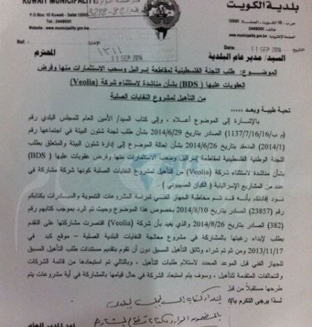 واشار مساعد المدير العام لشؤون قطاع المشاريع يوسف مناور في كتابه الى مدير عام بلدية الكويت احمد الصبيح بشأن طلب اللجنة الفلسطينية لمقاطعة اسرائيل وسحب الاستثمارات منها وفرض العقوبات عليها بشان مناشدة لاستثناء شركة "Veolia" من التاهيل لمشروع النفايات الصلبة حيث طالبت لجنة البيئة في المجلس البلدي خلال اجتماعها المنعقد بشان إحالة الموضوع الى ادارة شؤون البيئة في بلدية الكويت والمتعلق بطلب اللجنة الوطنية الفلسطينية لمقاطعة اسرائيل وسحب الاستثمارات منها وفرض عقوبات عليها باستثناء شركة "Veolia" من التاهيل لمشروع النفايات الصلبة كونها شركة مشاركة في عدد من المشاريع الاسرائيلية لافتا الى انه تمت مخاطبة الجهاز الفني لدراسة المشروعات التنموية والمبادرات بشان هذا الموضوع.