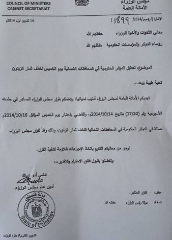 تلفزيون الفجر الجديد- أعلنت الأمانة العامة في مجلس الوزراء عن تعطيل الدوائر الحكومية في المحافظات الشمالية يوم الخميس القادم، لقطف ثمار الزيتون وذلك وفقا لقرار مجلس الوزراء.