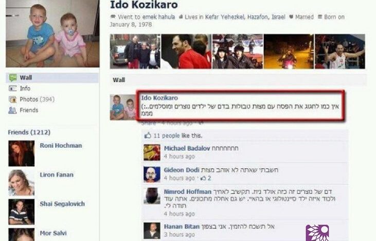 وكان آخر جرائم اليهود العنصرية وطبقاً لصحيفة “الوطن” البحرينية ما صرّح به لاعب كرة السلّة في المنتخب الإسرائيلي “عيدو كوجيكارو” على صفحته على موقع التواصل الاجتماعي، حيث قال: “أفضل شيء في الاحتفال بعيد الفصح هو تناول خبز “المصّة” المتبلة بدماء أطفال المسلمين والنصارى.. ممممم”. (אין כמו לחגוג את הפסח עם מצות טבולות בדם של ילדים נוצרים ומוסלמים..:) מממ)