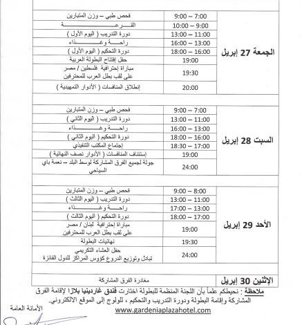 هذا وستقام على هامش البطولة دورة تدريبية بأشراف البروفيسور غراند ماستر فازوات لمدة يومين وكذلك سيتم عقد اجتماع للمكتب التنفيذي للاتحاد العربي للمواي تاي ،