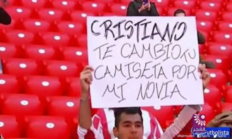 تلفزيون الفجر الجديد – قام مشجع للنجم البرتغالي كريستيانو رونالدو مهاجم ريال مدريد برفع لافتة قبل لقاء الفريق الملكي وأتلتيك بلباو مطالباً من خلالها قميص الدون مقابل خطيبته.