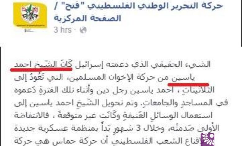 صفحة فتح الرسمية: الشيء الحقيقي الذي دعمته اسرائيل هو احمد ياسين