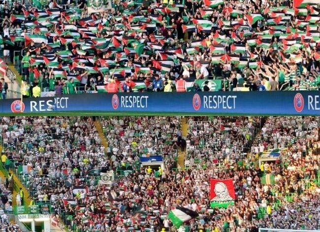 وفاجأت جماهير سلتيك غلاسغو النادي الاسرائيلي برفع الأعلام الفلسطينية في الشوارع المحاذية للملعب، وكان المنظر اكثر روعة على المدرجات حيث رفعت الجماهير الأعلام الفلسطينة إلى جانب شعار ناديها معبرة عن تضمنها مع الشعب الفلسطيني، رغم أن هذا قد يعرض ناديها لعقوبات من طرف الإتحاد الاوروبي لكرة القدم.