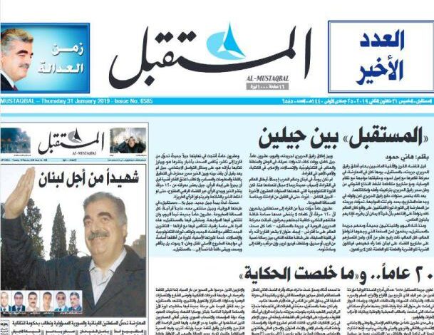 و"المستقبل" هي صحيفة لبنانية أسسها عام 1999، رئيس الوزراء الراحل، رفيق الحريري، الذي اغتيل في تفجير وسط العاصمة بيروت، يوم 14 فبراير/ شباط 2005.