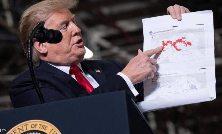 وكشف ترامب خلال حديث مع صحافيّين في البيت الأبيض خريطةً صغيرة تُمثّل سوريا، قائلاً "كلّ ما هو أحمر هو مناطق انتشار التنظيم ليلة الانتخابات في عام 2016".
