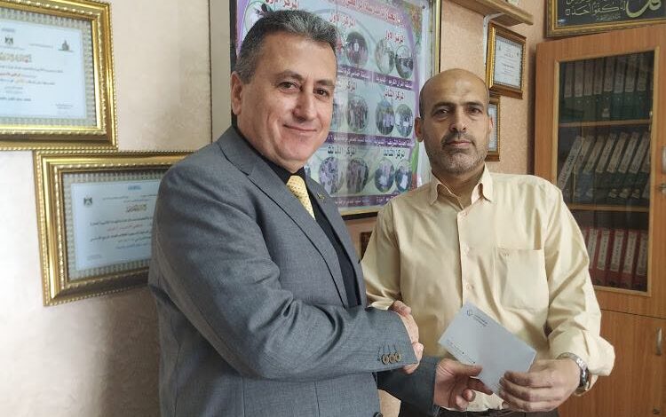 وقام مدير فرع جباليا زكريا صيام بزيارة المدرسة والتقى مديرها السيد أشرف الكرد ونائبه السيد صهيب حمودة وقام بتسليمهم قيمة التبرع.