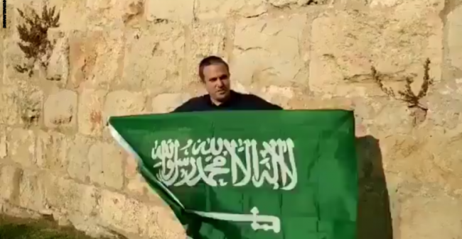 نشرت وزارة خارجية الاحتلال مقطع فيديو يظهر مستوطنا وهو يرفع علم المملكة السعودية وسط مدينة القدس.