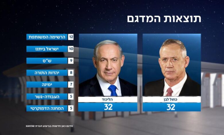 وحسب عينة استطلاعية من مراكز الاقتراع للقناة 12 فان الليكود حصل على 31 مقعدا وحزب ازرق ابيض على 33 . اما قناة 13 فاشارت الى ان حزب غانتس حصل حسب عينة استطلاعية على 33 والليكود 31 مقعدا والقائمة المشتركة على 11-13.