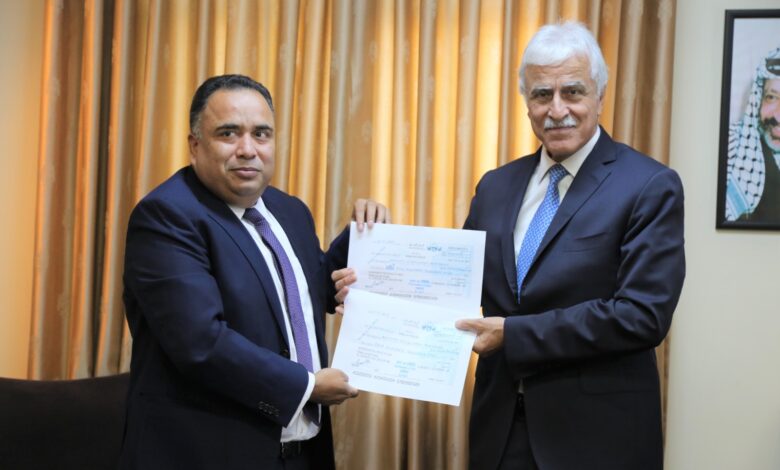 تسلم وزير التربية والتعليم أ.د. مروان عورتاني، اليوم، من ممثل جمهورية الهند لدى دولة فلسطين سونيل كومار؛ تمويلاً بقيمة 900 ألف دولار؛ كدفعة ثانية لبناء مدرستين جديدتين في بلدة طمون وقرية مثلث الشهداء في قباطية، وتوسعة مدرسة جواهر لال نهرو في بلدة أبو ديس.