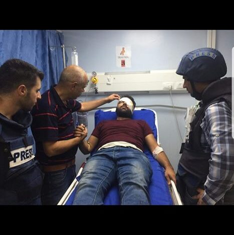 تلفزيون الفجر | اصيب المصور الصحفي معاذ عمارنة بجروح في عينه، خلال اعتداء قوات الاحتلال على مواطنين وصحفيين في بلدة صوريف شمال غرب الخليل، والذين اقاموا الصلاة في تلك المنطقة احتجاجاً على مصادرة اراضيهم.