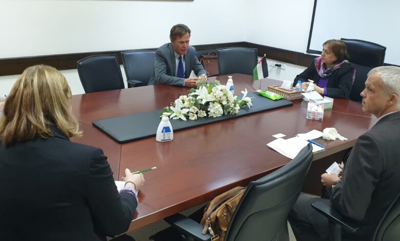 بحثت وزيرة الصحة د. مي الكيلة مع ممثل الاتحاد الأوروبي في فلسطين سفن كون فن بورجسدرف جهود الحكومة الفلسطينية ووزارة الصحة لمواجهة فيروس كورونا.