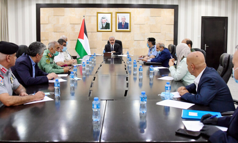 بحث رئيس الوزراء محمد اشتية مع قادة الأجهزة والهيئات الأمنية، الإجراءات الجديدة للحد من تفشي فيروس كورونا، على ضوء توصيات اللجان الصحية، بعد وصول الإصابات إلى معدلات كبيرة، وذلك قبل رفع التوصية النهائية إلى الرئيس محمود عباس.