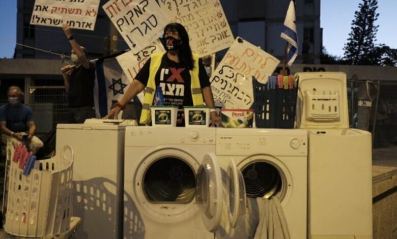 وقام مستوطنون بوضع غسالات قرب منزل نتنياهو للسخرية من أخذ ملابسه المتسخة لواشنطن لغسلها مجانا خلال رحلاته الرسمية.