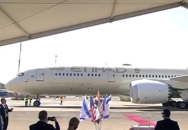 وأقلعت من أبوظبي طائرة تابعة لشركة الاتحاد للطيران تقل مسؤولين بالحكومة الإماراتية ترافقهم شخصيات أمريكية في طريقها إلى مطار بن غوريون بتل أبيب، وفقا لموقع فلايت رادار 24 لتتبع مسار الطائرات.