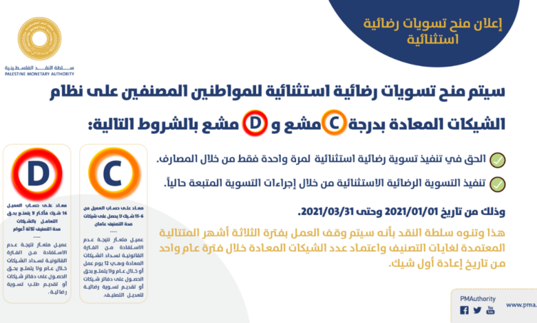 أعلن معالي محافظ سلطة النقد السيد عزام الشوا عن السماح للمواطنين المصنفين على النظام C و D مشع على نظام الشيكات المعادة إجراء تسوية رضائية استثنائية للشيكات المعادة على حسابهم وتعديل تصنيفهم حسب الأصول وذلك اعتباراً من تاريخ 01/01/2021 وحتى 31/03/2021، بحيث يتمكن المواطنون المصنفون ولم يستطيعوا سابقاً إجراء تسوية رضائية للشيكات المعادة مراجعة المصرف الذي يتعاملون معه والقيام بتسوية رضائية استثنائية لتعديل تصنيفهم وذلك لمرة واحدة فقط، على أن يتم بعد هذا التاريخ وقف استلام طلبات الاسترحام لإجراء تسوية رضائية استثنائية.