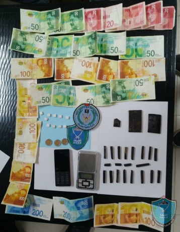 وخلال عملية تفتيش المركبة تم ضبط  20 اصبع من مادة بنيه يشتبه انها مادة الحشيش المخدرة وضبط 3 قطع بنيه ايشتبه انها مادة الحشيش المخدر بلغ وزنها الاجمالي (97.1) غم قائم وضبط حبوب بيضاء يشتبه انها حبوب الاكستازي المخدرة عدد(10) وضبط ميزان حساس وضبط مبلغ مالي 2280 شيقل متحصلات بيع مواد مخدرة وتم ايضا ضبط نصف سيجارة بداخلها تبغ مخلوط بمادة بنيه يشتبه انها مادة الحشيش المخدرة