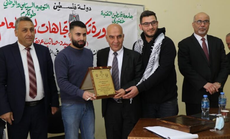 وفي ختام اليوم الأول من الدورة، أشاد رئيس الجامعة أ.د نور الدين أبو الرب بالدورة المعقدة، مؤكدا أن الجامعة تمد أيديها لجميع الشركاء من أجل المساهمة في دفع عجلة التنمية المجتمعية، والمشاركة في بناء الوطن والمواطن، وكرم اللواء عدنان الضميري مقدما له درع جامعة فلسطين التقنية-خضوري، وذلك بحضور مجلس الطلبة والشبيبة الفتحاوية الذي كرم اللواء عدنان الضميري.