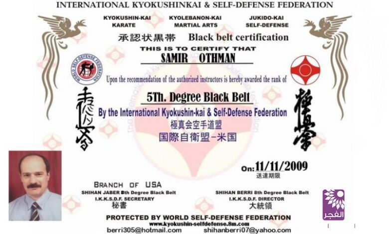 الإتحاد الدولي للكيوكو شنكاي والدفاع عن النفس يمنح سمير عثامنة شهادة الحزام الأسود 5 دان الفخرية