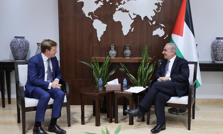 استقبل رئيس الوزراء محمد اشتية، اليوم الخميس، في مكتبه بمدينة رام الله، مدير شؤون الشرق الأوسط وشمال إفريقيا في وزارة الخارجية والتنمية البريطانية ستيفن هيكي، وبحث معه خطورة إعلان رئيسة الوزراء البريطانية نيتها “مراجعة” وضع السفارة البريطانية وموقعها في إسرائيل، والانتهاكات الإسرائيلية المتصاعدة، بحضور القنصل البريطاني العام في القدس ديان كورنر.