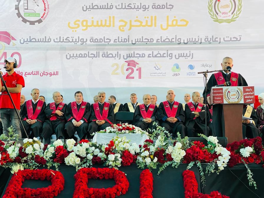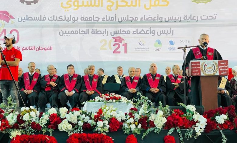 احتفلت جامعة بوليتكنك فلسطين في الخليل، بتخريج الفوجين التاسع والثلاثين والأربعين من طلبة البكالوريوس والماجستير، بحضور عضو اللجنة التنفيذية لمنظمة التحرير الفلسطينية ورئيس مجلس رابطة الجامعيين ورئيس مجلس أمناء جامعة بوليتكنك فلسطين أحمد سعيد بيوض التميمي، وأعضاء مجلس رابطة الجامعيين، ورئيس جهاز المخابرات العامة الفلسطينية اللواء ماجد فرج، ومحافظ الخليل اللواء جبرين البكري، ورئيس الجامعة أمجد برهم، ونوابه، ورؤساء جامعات، ومدراء التربية والتعليم، وعمداء الكليات وأعضاء الهيئتين الأكاديمية والإدارية، وقادة من الاجهزة الامنية في المحافظة، وامناء سر الاقاليم، وحشد كبير من رؤساء وممثلي المؤسسات الحكومية والأهلية والمجتمعية ورجال العشائر في المحافظة إضافة إلى جمع غفير من أولياء أمور الخريجين.