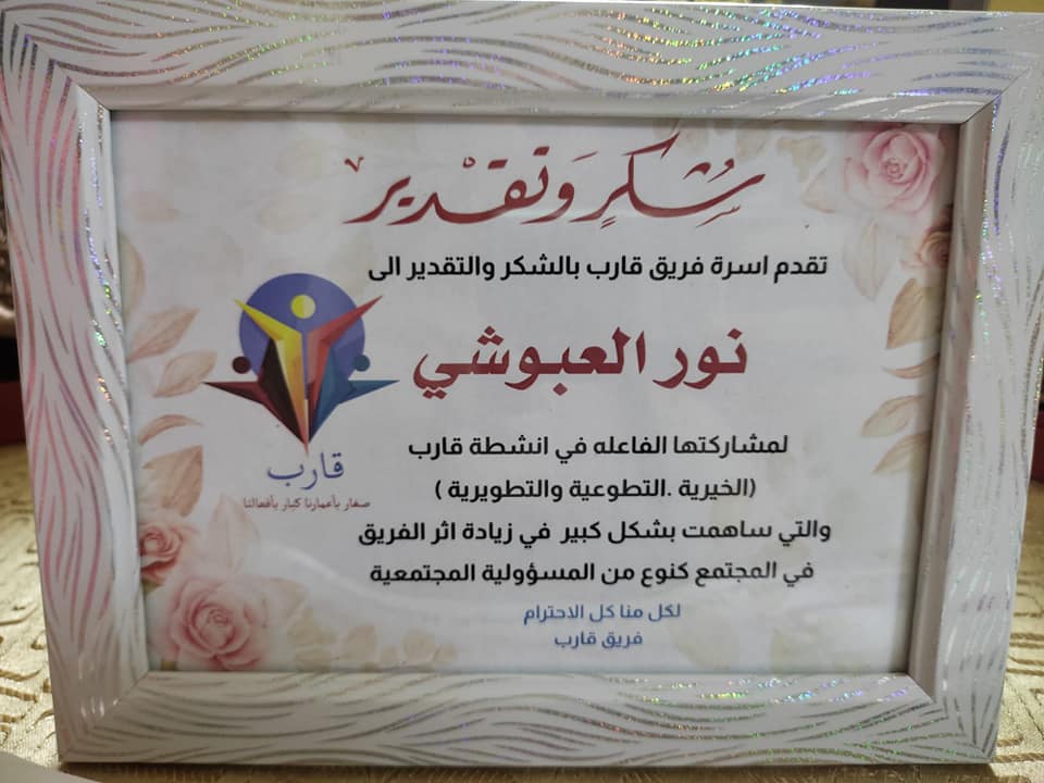 سفيرة الإعمال التطوعية الخيرية وريادية الأفكار .. نور محمود عبوشي تحصل على لقب نجمة مجموعة ( قارب )