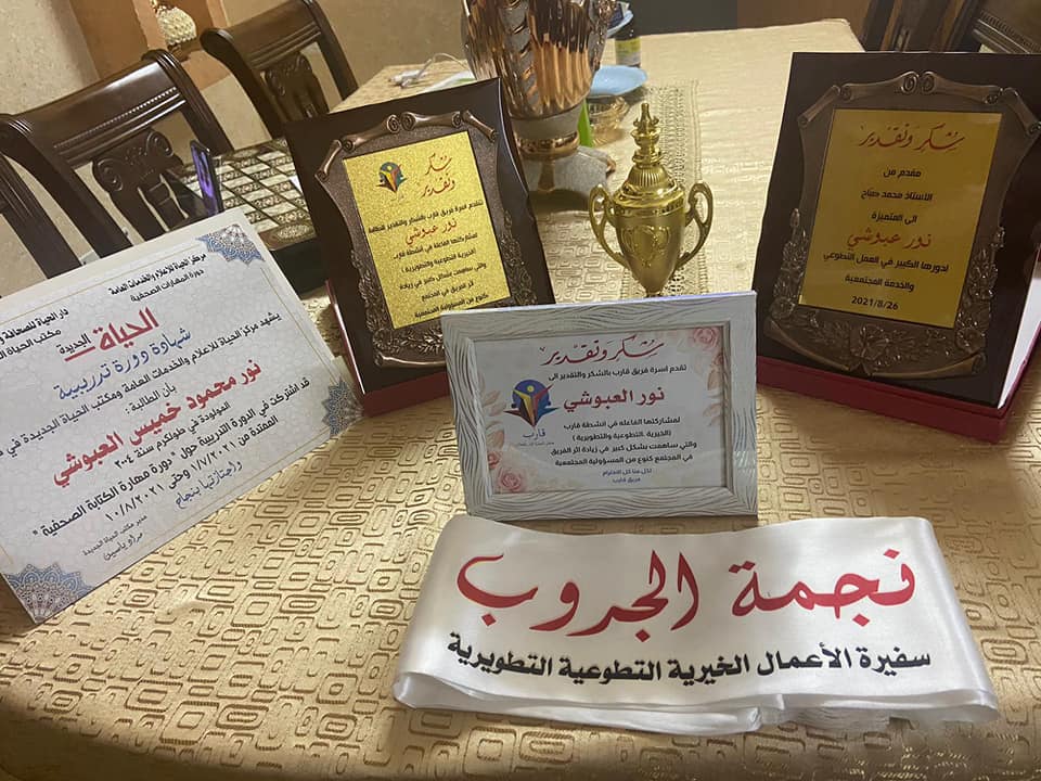 حازت الطالبة المبدعة المتألقة في كل المواقع نورمحمود عبوشي على اللقب الحصري والأفضل لقب نجمة جروب ( قارب ) كونها أفضل سفيرة للأعمال التطوعية الخيرية ضمن مجموعتها.