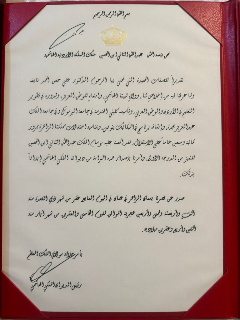 لدوره الريادي الكبير ومساحته الطويله والتي من خلالها كان متميزاً علمياً وكان من الأوائل في اثراء العلم الهندسي في العالم استحق ونال المرحوم د علي نايفة ابن بلدة شويكة قضاء طولكرم من الدولة الأردنية. شهادة تقديراً لمكانته التي استحقها بجدارة ، المرحوم نايفة كان من الأنفاس القوية التي كانت تعمل في كل المواقع وداعم مهم لفلسطين مسقط رأسه ليكون رجل عمل بصمت لأجل علم كان دافعه وايمانه الأول كون فلسطين لا تملك سوى سلاح العلم . نادي الفاضلية برئاسة الدكتور فتحي ابو عرجة واعضاء نادي الفاضلية في الأردن عبروا عن اعتزازهم وفخرهم بابن الفاضليه والعضو الموءسس في نادي خريجي المدرسه الفاضليه ،