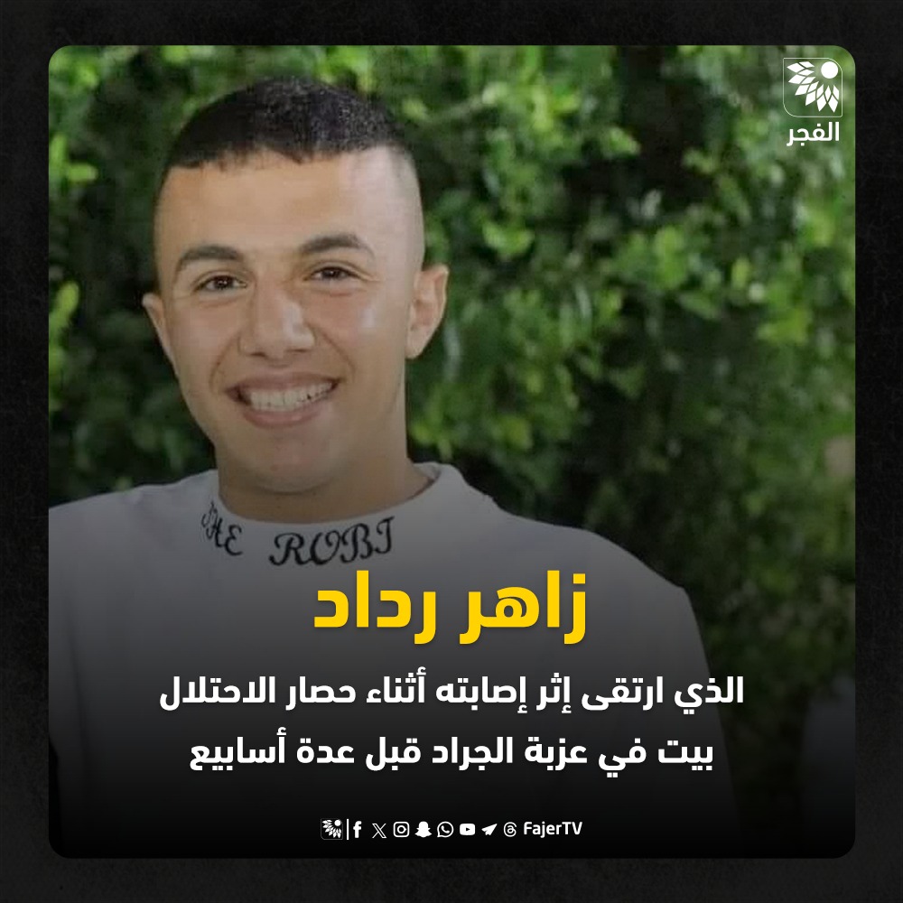 استشهد، اليوم الأحد، المعتقل الجريح زاهر تحسين يوسف رداد (19 عاما)، من بلدة صيدا شمال طولكرم، أثناء تواجده في أحد المستشفيات داخل أراضي الـ48.