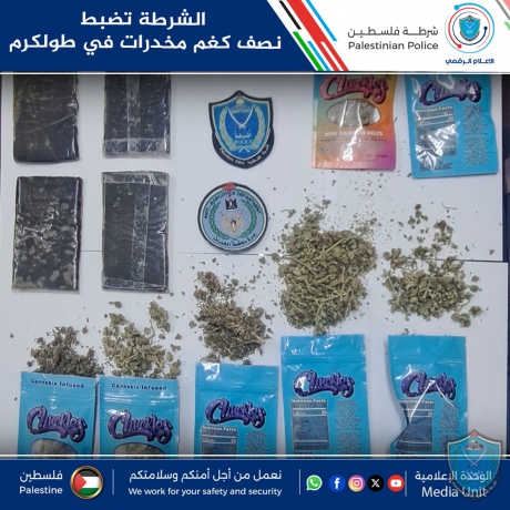 ضبطت الشرطة اليوم الاربعاء نصف كغم من مادة يشتبه انها الحشيش المخدر بحوزة تاجر مخدرات في طولكرم.