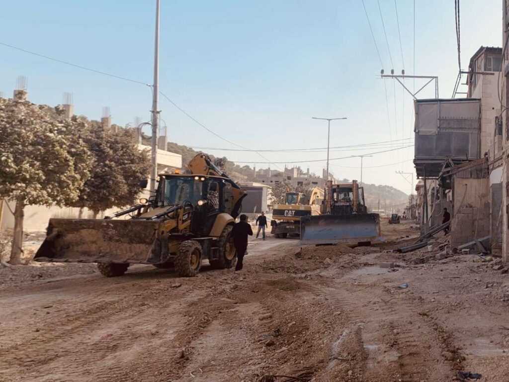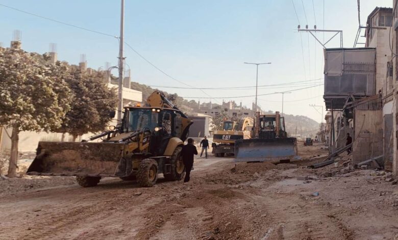 بلدية طولكرم تباشر العمل بطواقمها وآلياتها في الشارع الرئيس لمخيم نورشمس