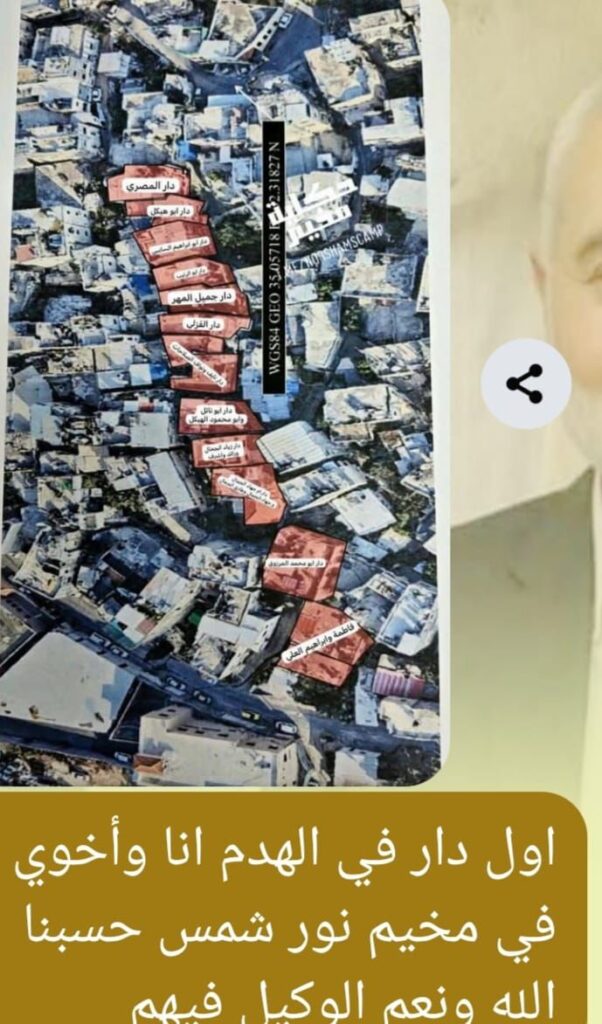 منتصر العناني – بحسب قرار التبيلغ الذي أشارت فيه سلطات الاحتلال الإسرائيلي للمواطنين في مخيم نورشمس لهدم اكثر من 25 منزلاً ، الحاجة فاطمة العلي وشقيقها ابراهيم أولى المنازل بحسب المخطط الذي نشرته قوات الاحتلال لعملية الهدم سابقاً ، وتم التنسيق لاخلاء المنازل التي بدأت اليوم ، الحاجة فاطمة تقول وهي سارعت لاخلاء منزلها يوم أمس تقول وبصوت مجروح الى أين أذهب مليش محل اروح عليه شو نعمل يا ربي ، يبقى الوجع كبيراً والألم أكبر في النزوح عن مكان خلقنا وتربينا تحت سمائه الى متى هذا القهر ، هو الحال على مخيماتنا نزوح وتدمير وهدم الى متى ،، الوجع الأكبر عندما تقف الحاجة فاطمة وشقيقها ابراهيم العلي ومن شملهم قرار الهدم من أبناء مخيم نورشمس وهم ينظرون الى أسمان جرافات الاحتلال الملعونة وهي تهدم بيوت العُمر أمام مرأى عيونهم ،، هنا الدموع تذرف على ألمٍكبير لا يستطيعون فعل شيئ امام هذا القهر بعينه ، ويطالبون العالم بالتحرك لوقف مت تفعله اسرائيل بالمخيمات ، هذا الهدم والقتل والتدمير لن يثني عن البقاء لحلم العودة الى مخيماتنا يبقى شاهداً أمام ما يفعلوه من جرائم بحق الإنسانية ومخيماتنا التي ستبقى شاهداً على حق العودة .
