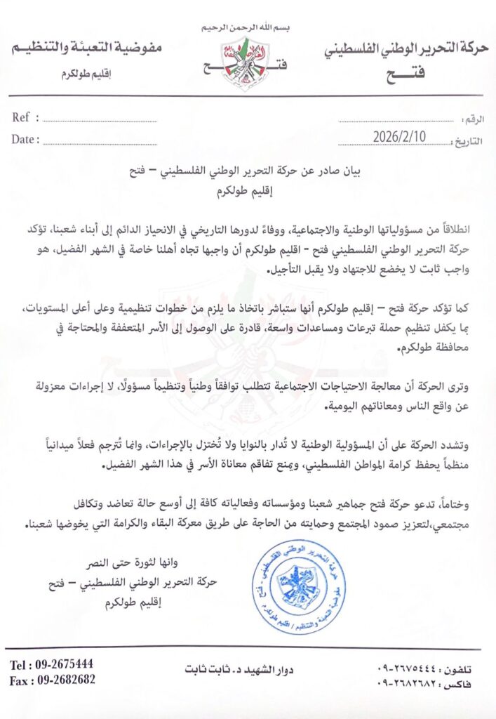 أصدرت حركة التحرير الوطني الفلسطيني فتح إقليم طولكرم بياناً ، ونص البيان : انطلاقاً من مسؤولياتها الوطنية والاجتماعية، ووفاءً لدورها التاريخي في الانحياز الدائم إلى أبناء شعبنا، تؤكد حركة التحرير الوطني الفلسطيني فتح – إقليم طولكرم أن واجبها تجاه أهلنا خاصة في الشهر الفضيل، هو واجب ثابت لا يخضع للاجتهاد ولا يقبل التأجيل.