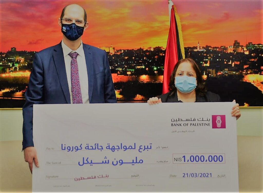 قدم بنك فلسطين مبلغ مليون شيكل تبرعاً لوزارة الصحة، حيث سيتم تخصيصها لشراء سيارات لنقل الكوادر الطبية إلى منازل مصابي جائحة كورونا في المنازل، بالإضافة الى تقديم الرعاية الأولية للمرضى في كافة المحافظات الفلسطينية. ويأتي هذا التبرع من البنك إنطلاقاً من إيمانه بضرورة الوقوف إلى جانب أبناء وبنات شعبنا، وتعزيزاً لإمكانيات وزارة الصحة في مواجهة الجائحة.