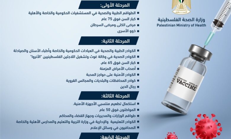 تلفزيون الفجر | أعلنت وزارة الصحة الفلسطينية أن حملة التطعيم ضد فيروس كورونا ستكون على أربع مراحل، وستشمل جميع الفئات المستهدفة وفق توصيات منظمة الصحة العالمية.