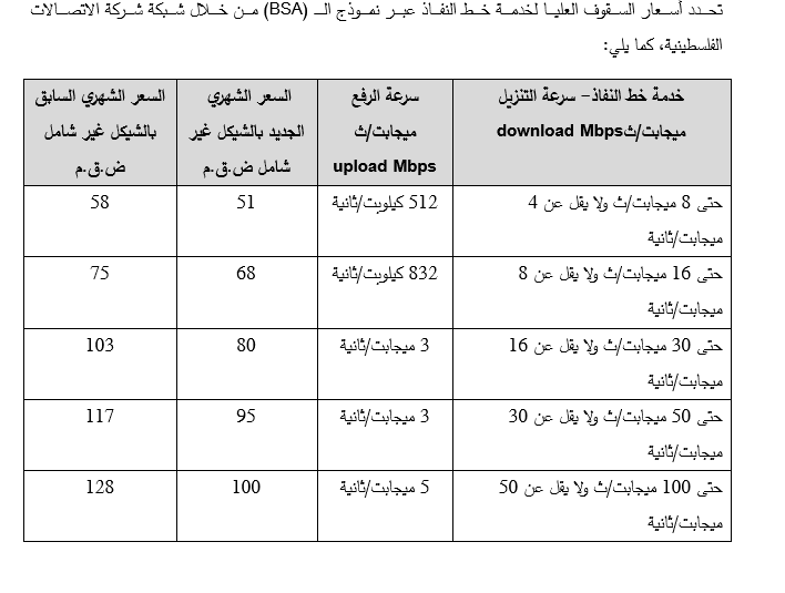 وقال “تم إبلاغ شركة الاتصالات الفلسطينية (بالتل) بهذا القرار، والتي ستعلن بدورها عن الأسعار الجديدة، ليتسنى للمواطنين الاستفادة من الخصومات المعلنة، والانتقال لسرعات أعلى بكلفة أقل”.