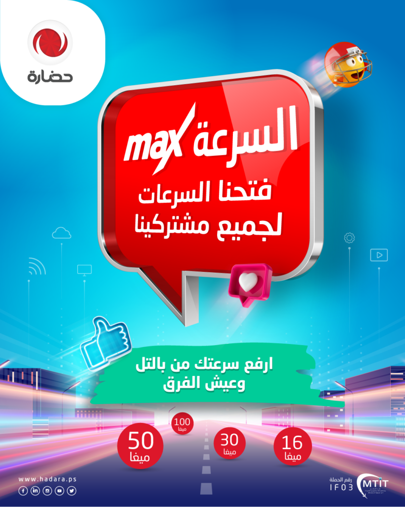 أعلنت شركة حضارة للاستثمار التكنولوجي وهي إحدى شركات مجموعة الاتصالات الفلسطينية اليوم عن رفع سرعات مشتركيها ضمن حملتها الجديدة ” السرعة ماكـــس ” .