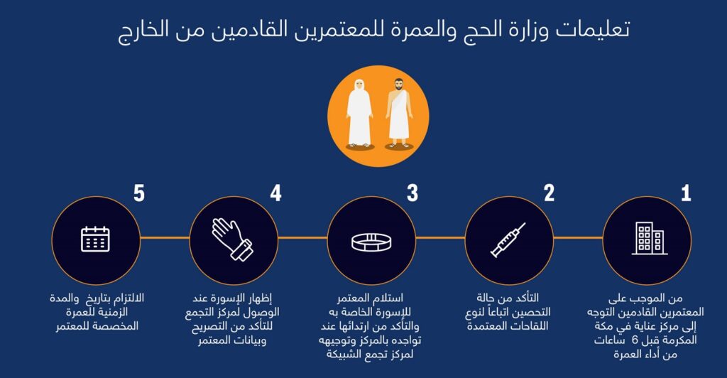 وإليكم نظرة في الإنفوغرافيك أعلاه على الضوابط المذكورة من وزارة الحج والعمرة للمعتمرين القادمين من الخارج.