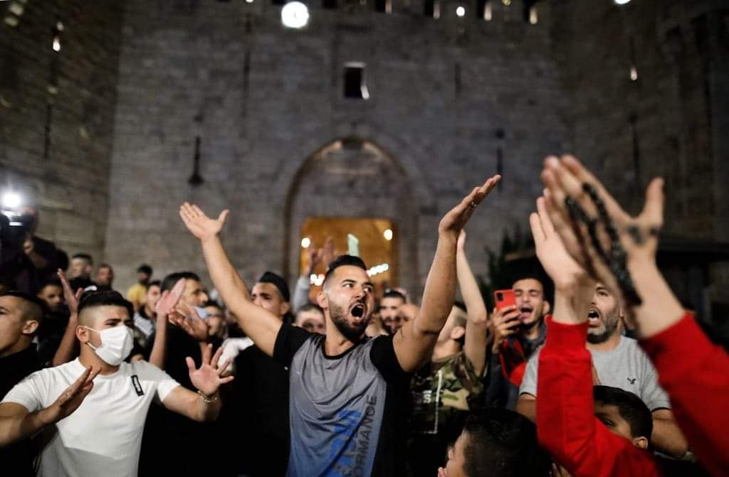 وأدى مساء اليوم، آلاف المواطنين صلاتي العشاء والتراويح في رحاب المسجد الأقصى المبارك، وعند الانتهاء منها تجمهروا عند باب العامود، مرددين الهتافات والشعارات الوطنية.
