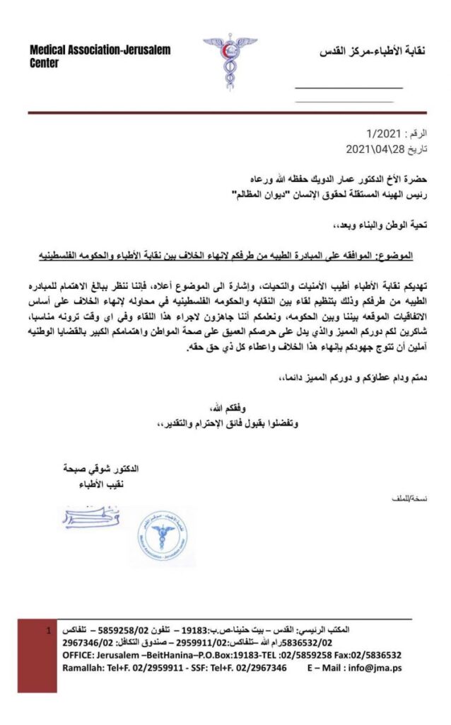استجابت نقابة الأطباء، الأربعاء، للدعوة التي وجهتها الهيئة المستقلة لحقوق الانسان (ديوان المظالم) بتنظيم لقاء بين النقابه والحكومه الفلسطينيه في محاولة لإنهاء الخلاف على أساس الاتفاقيات الموقعة بينها وبين الحكومة.