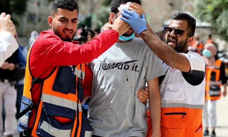 من جانبه، قال الهلال الأحمر الفلسطيني : “إن الاحتلال يمنع الطواقم الطبية من الدخول من خارج المسجد الأقصى إلى الداخل لتقديم العلاج للمصابين”.