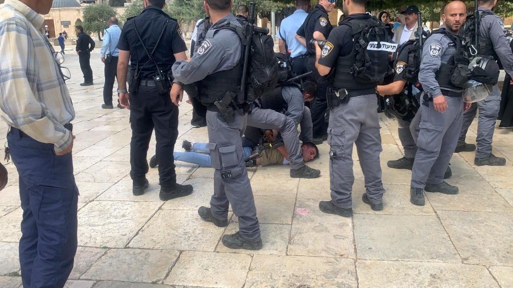 وقال شهود عيان لـ”وفا”، إن عشرات جنود الاحتلال، اقتحموا ساحات المسجد الأقصى، لتأمين اقتحامات المستوطنين، واعتدوا على المصلين بالضرب المبرح، واعتقلوا أربعة منهم، لم تعرف هوياتهم بعد، إضافة إلى أحد حراس المسجد فادي عليان.