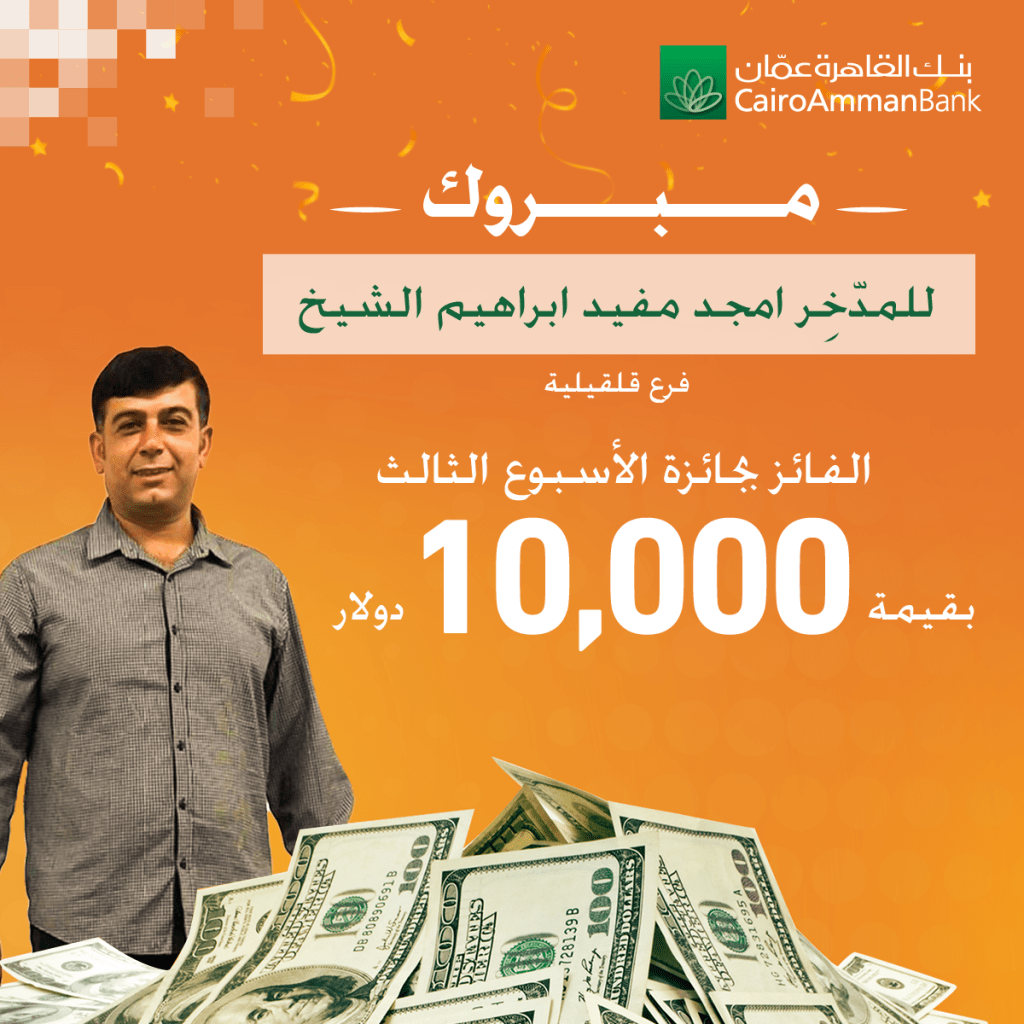 أعلن بنك القاهرة عمان، عن اسم الفائز بالجائزة النقدية للأسبوع الثالث، ضمن حملة حسابات التوفير “ربحك قدام عيونك” بقيمة 10 آلاف دولار أمريكي لكل جائزة.