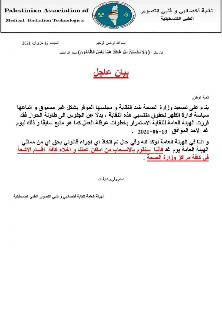 حذرت الهيئة العامة لنقابة اخصائيي وفنيي التصوير الطبي الفلسطينية، من المساس بأي من ممثليهم، مهددين بأنهم بالانسحاب من أماكن عملهم واخلاء كافة اقسام الأشعة في كافة مرافق وزارة الصحة.