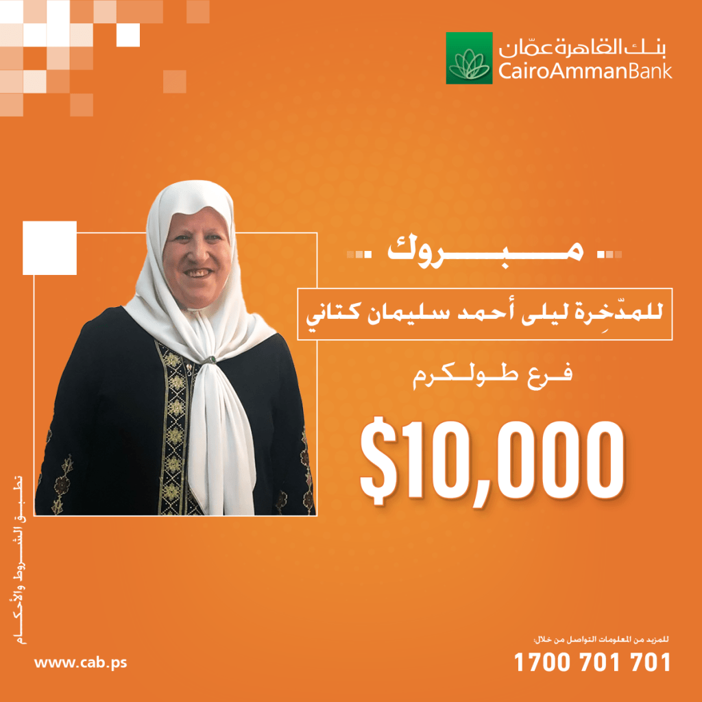 أعلن بنك القاهرة عمان، عن اسم الفائزة بالجائزة النقدية للأسبوع الرابع، ضمن حملة حسابات التوفير “ربحك قدام عيونك” بقيمة 10 آلاف دولار أمريكي لكل جائزة، وكانت الجائزة من نصيب السيدة ليلى احمد سليمان كتاني، المدخرة لدى فرع بنك القاهرة عمان في محافظة طولكرم.